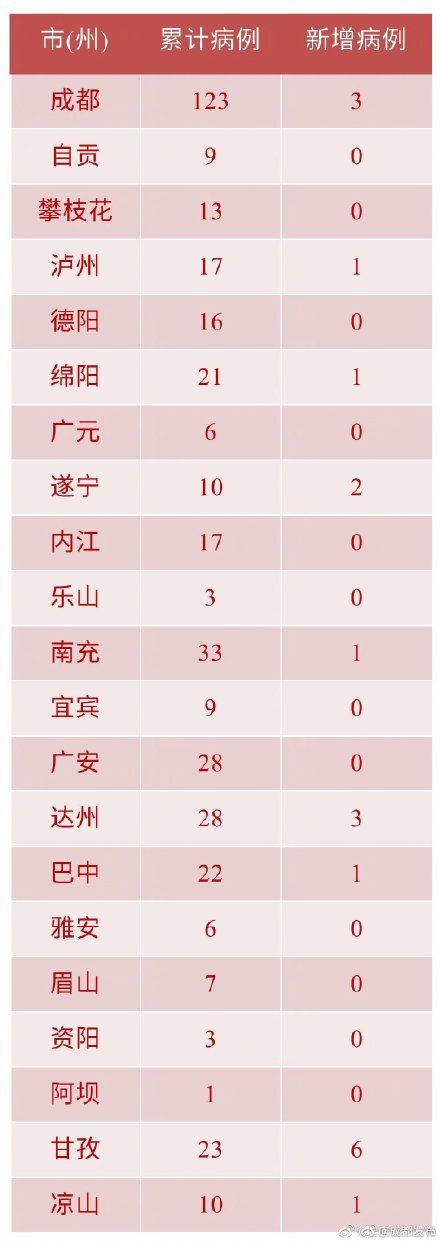 【截至2月9日24时 四川省新型冠状病毒肺炎疫情最新情况】2月9日0-24时,四川省新型冠状病毒肺炎新增确诊病例19例,新增治愈出院病例16例,无新增死亡病例。新增确诊病例中,甘孜州6例、成都市3例、达州市3例、遂宁市2例、泸州市1例、绵阳市1例、南充市1例、巴中市1例、凉山州1例。新增治愈出院病例中,攀枝花市4例、成都市3例、宜宾市3例、绵阳市1例、广元市1例、南充市1例、雅安市1例、资阳市1例、凉山州1例。截至2月9日24时,我省累计报告新型冠状病毒肺炎确诊病例405例,涉及21个市(州)、124个县(市、区)。405名确诊患者中,正在住院隔离治疗328人(其中危重18人),已治愈出院76人,死亡1人。当日解除医学观察1079人,现有6912人正在接受医学观察。